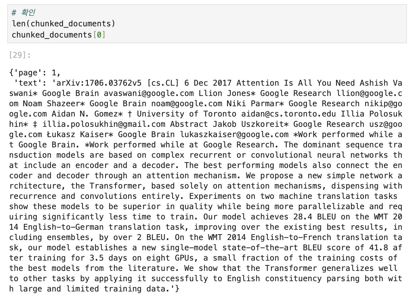대개 문단 단위로 자르는 로직, 토큰 갯수로 자르는 로직 등이 있으며 본 튜토리얼에서는 편의상 토큰 갯수로 자르는 로직을 구현한다. 목적에 따라 필요한 분할 로직을 활용하는게 바람직하다.