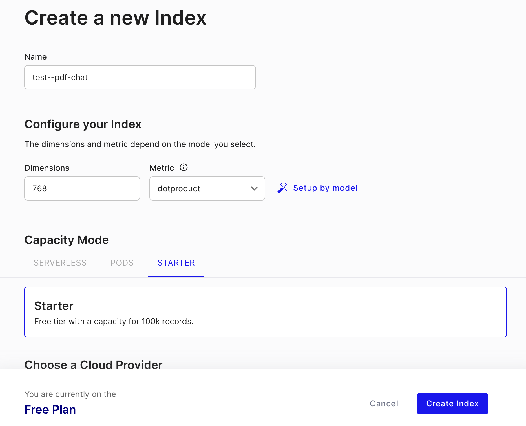 - 먼저 Pinecone에서 활용할 인덱스를 생성해줍니다. sentence-transforemers 가 768차원의 벡터를 반환하므로 해당 값을 Dimensions에, 유사도 검색에 활용하고자 하는 메트릭을 Metric에 선택해주면 된다.